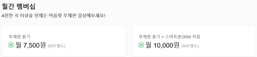 월 이용요금은 스트리밍만 이용할 경우 한 달에 7,500원(부가세 별도), 스마트폰으로 drm 저장까지 할 경우 월 10,000원의 이용요금이 발생합니다. 참고로 스마트폰에 다운받은 drm 형식의 파일은 다른기기에서 듣는 건 안되고 해당 스마트폰에서만 재생이 가능합니다.