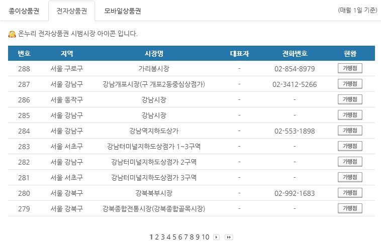위 사이트에서 지도 내 시도, 시군구를 클릭하면 아래표에서 가맹시장, 가맹점을 리스트로 확인할 수 있습니다. 찾는 방법으로는 먼저 시도나 시군구를 클릭하고 종이상품권 또는 전자상품권을 선택한 후 시장별 현황에서 [가맹점] 버튼을 클릭하시면 됩니다.