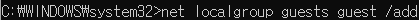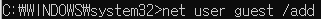 명령 프롬프트창이 열리면 'net user 계정이름 /add', 'net localgroup guests 계정이름 /add'를 입력하여 게스트 그룹에 게스트 계정을 추가할 수 있습니다.