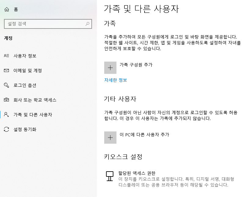 이 메뉴에서 사용자 추가를 한다 해도 별도의 마이크로소프트 이메일 계정을 입력해야 합니다. 단순 게스트 계정을 만드는 용도로는 부적합합니다.