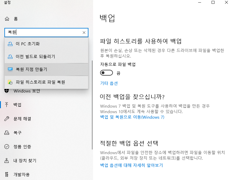 다음은 컴퓨터 복구 방법으로 미리 저장해놓은 백업 데이터를 선택해서 현재의 시스템에 복원하기 위해서는 설정메뉴 검색창에서 '복원'을 입력하고 파일 히스토리로 파일 복원을 선택하여 지난 백업 데이터 중 선택해서 복구 진행하면 됩니다.