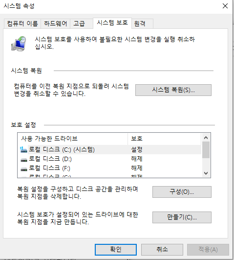 복원 지점 만들기를 클릭하면 시스템 속성으로 이동하게 되는데, 이 곳에서 구성 버튼을 클릭해서 디스크 백업 설정과 백업 진행이 가능하고 '시스템 복원' 버튼을 눌러서도 컴퓨터 복구가 가능합니다.