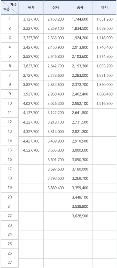 먼저 부사관 월급입니다. 하사관부터 중사, 상사, 원사까지의 봉급표를 보여주고 있습니다. 각 계급별로 올라갈수 있는 호봉이 각각 다릅니다. 2020년 하사 1호봉 기준 월 1,661,200원부터 원사 15호봉 기준으로 월 4,527,700원의 봉급을 받게 됩니다.