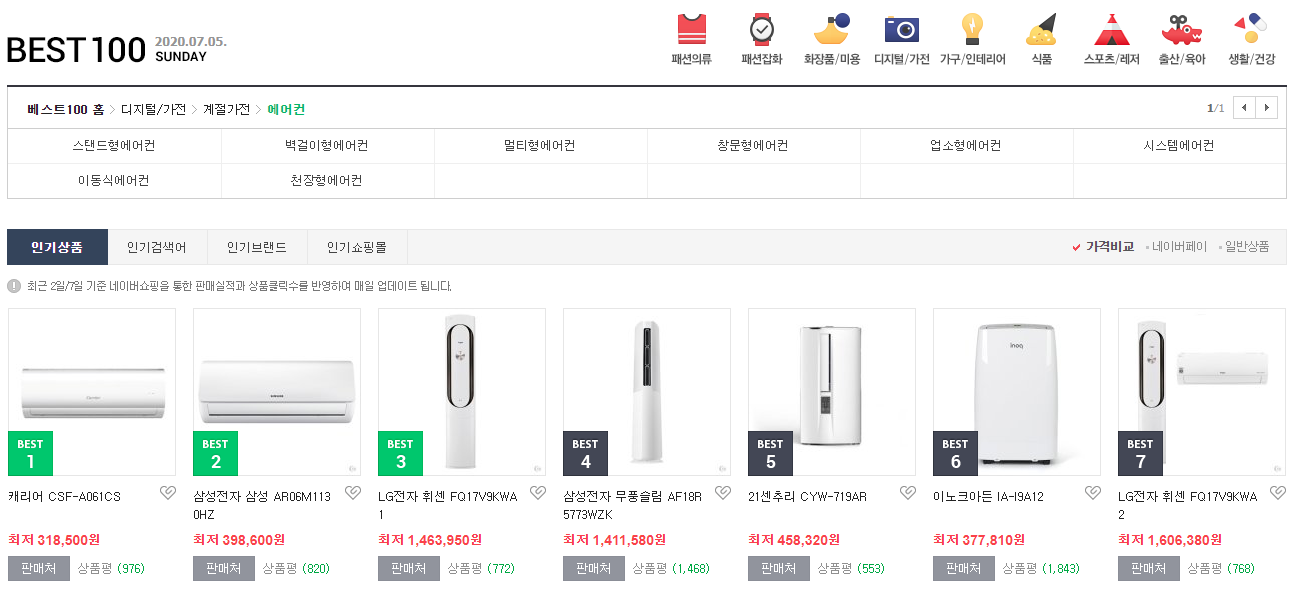 여기가 네이버 쇼핑 베스트 100에서 에어컨 카테고리로 들어온 화면입니다. 첫 화면에서부터 차례대로 디지털/가전 > 계절가전 > 에어컨으로 들어온 상태이며 여기서 스탠드형 에어컨을 찾을지, 벽걸이형 에어컨을 검색할지 다시 세부 카테고리를 선택해줍니다.