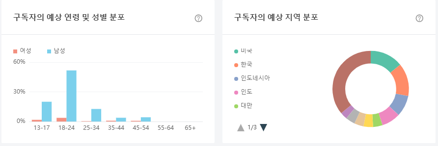또 볼 수 있는 재미있는 데이터로, 이 채널을 구독하고 있는 연령대가 어떻게 되는지 성별은 어떻게 이루어져있는지, 그리고 구독자 수 대비 조회수, 좋아요와 싫어요 수, 댓글 수 등 채널의 구독자가 얼만큼 충성도를 갖고 있는지 또 얼마만큼 실속있게 운영되고 있는지를 객관적인 지표를 통해 알 수 있습니다.