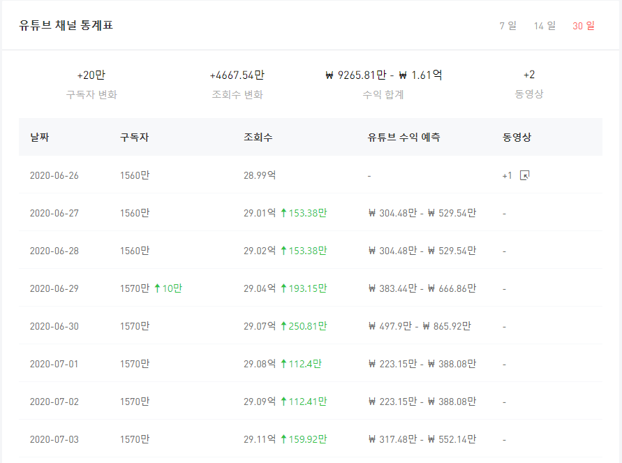 기간별로 채널 구독자 변화가 얼마나 있었고 동영상 조회수와 예상 수익의 변화까지 알아볼 수 있는 점도 재미있는 자료가 되는 것 같습니다.