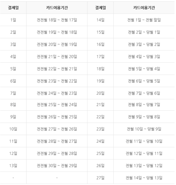 kb국민카드 홈페이지에 나와있는 내용으로 결제일자별로 카드이용기간에 대해서 보여주고 있습니다.