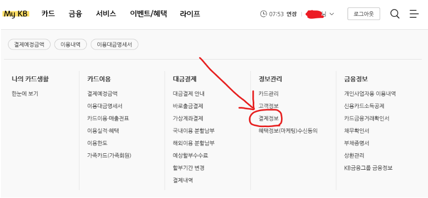 결제일자 변경은 국민카드 홈페이지 또는 kb국민카드 어플을 통해서 가능한데, 먼저 공인인증서 로그인을 한 뒤 My KB > 정보관리 > 결제정보 메뉴로 들어갑니다.