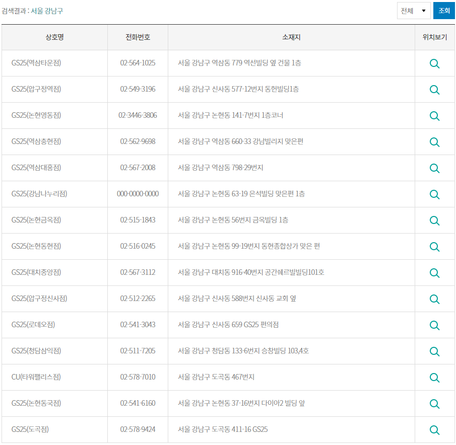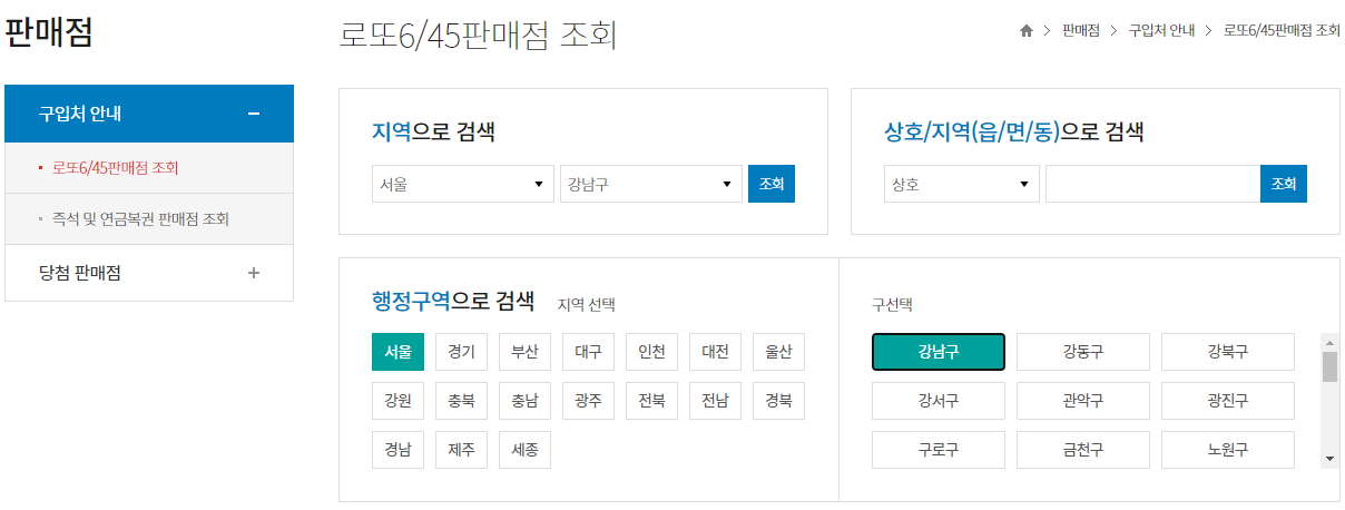 찾고자 하는 지역명을 선택하고 조회버튼을 누르면 위처럼 해당 주소지에 위치한 복권 판매점을 모두 조회하실 수 있습니다.