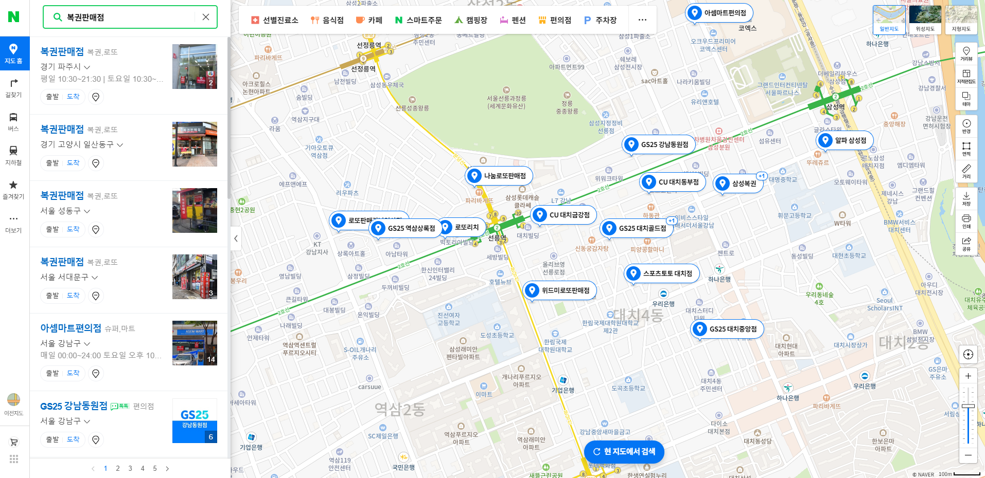 주변 가까운 복권방을 찾는 또다른 방법은 바로 네이버나 다음 지도에서 검색창에 복권이라고 검색을 하는 것입니다. 찾고자 하는 지역으로 지도를 위치시킨 뒤 검색창에 복권 또는 로또라고 검색을 하면 지도상에 바로 복권 판매점 위치를 보여줍니다.