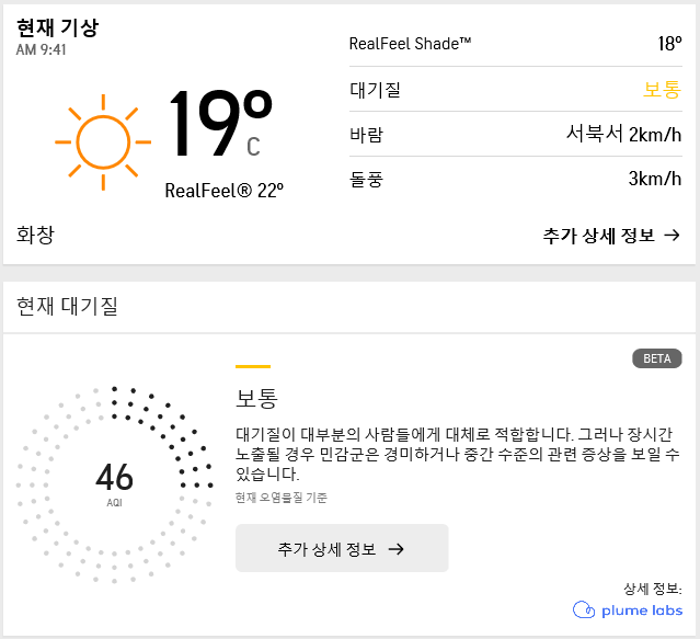 지역명을 클릭해서 들어오면 기본적으로 날씨 사이트에서 보여주는 현재 날씨와 대기 상태, 그리고 시간대에 따른 날씨 변화도 보여줍니다. 하지만 아큐웨더 사이트의 가장 큰 장점이자 특징을 바로 다음에서 찾을 수 있습니다.