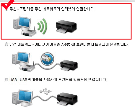 프로그램을 실행하기 전 프린터 전원을 켭니다. 그리고 다운받은 소프트웨어 설치파일 실행하고 설치를 진행하다 보면 연결 옵션 선택 항목이 나오게 됩니다. 여기서 유선 네트워크나 USB 연결이 아닌 무선 연결을 선택해줍니다. 이 옵션을 선택해야만 정상적으로 hp프린터 무선연결 설정이 가능합니다.