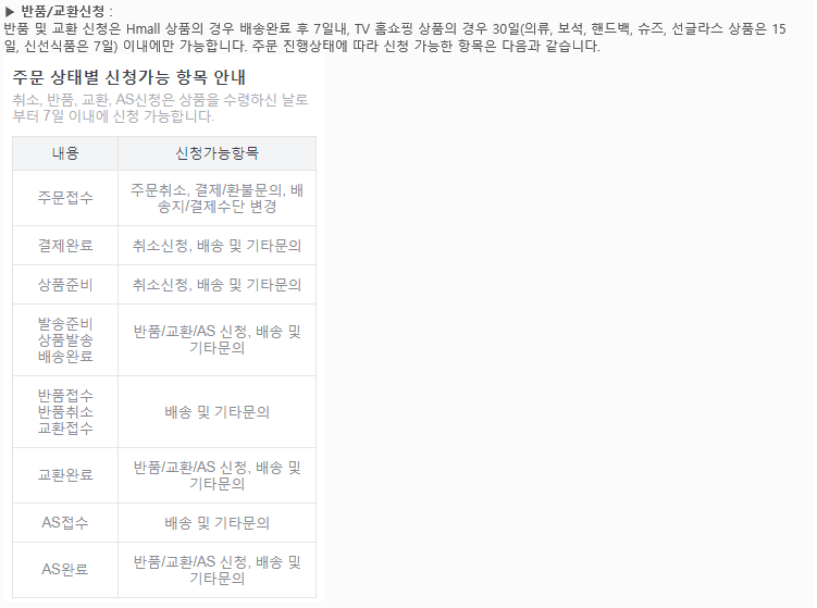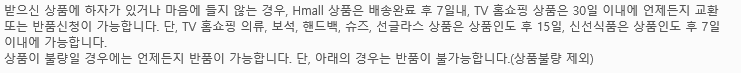 반품 교환 신청은 Hmall 상품의 경우 배송완료로부터 7일 이내, TV홈쇼핑(현대홈쇼핑 채널) 상품의 경우 배송완료일로부터 30일 이내에만 가능합니다. (의류, 보석, 핸드백, 슈즈, 선글라스 상품의 경우 15일 이내, 신선식품은 7일 이내)
