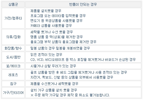 각 상품군에 따라 위의 경우에 해당한다면 정해진 기간 이내라 할지라도 반품이 불가하니 반품 신청 전에 확인해보시길 바랍니다.