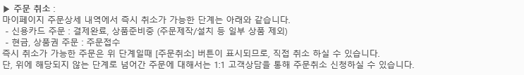 참고로 신용카드 결제한 경우에는 결제완료 단계나 상품준비중 단계일 때는 즉시 취소가 가능하고 현금 또는 상품권 결제한 경우에는 주문접수 단계에서 주문을 즉시 취소할 수 있습니다.