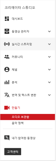 그럼 다음과 같이 화면 좌측 메뉴 하단에 만들기 - 오디오 보관함이 보이실거에요. 해당 메뉴를 클릭해봅니다.