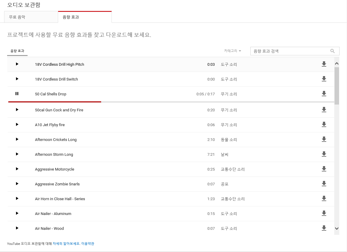 무료 효과음악으로도 교통수단 소리, 가구소리, 현장음, 공포분위기, 동물 소리, 충돌음, 사람 목소리 등 다양한 음원을 제공하고 있습니다.