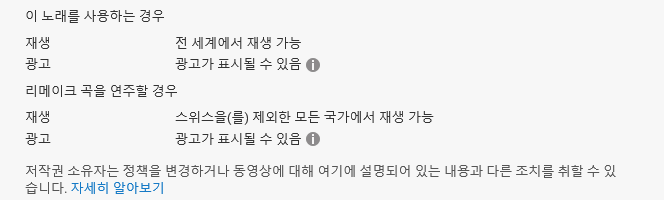 크리에이터 스튜디오 내 음악 정책에서는 유튜브에서 사용가능한 노래 목록과 저작권 소유자가 설정한 각 노래에 대한 정책을 확인하실 수 있습니다.