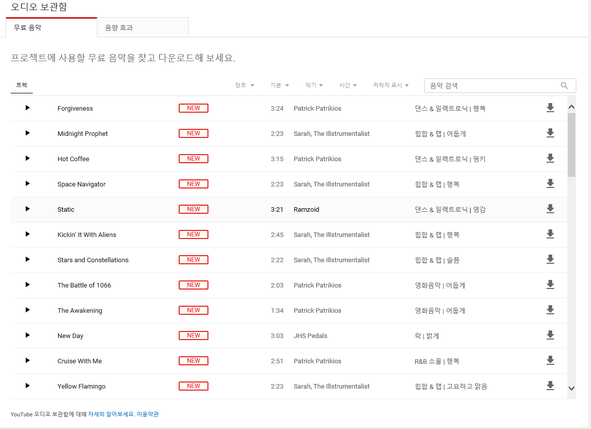 오디오 보관함에는 유튜브 동영상에 사용 가능한 다양한 무료 음악을 확인하실 수 있습니다.