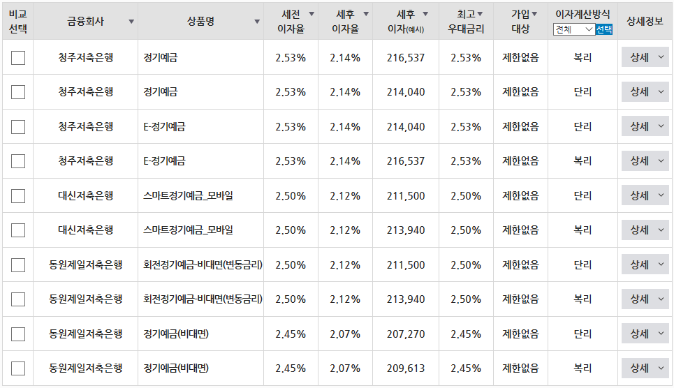 위 그림은 1천만원을 12개월 예금으로 넣었을 때 가장 금리가 높은 저축은행을 순위별로 보여주는 표입니다. 지금 시점에서는 청주저축은행이 세전이자율 2.53%로 가장 높은 것으로 나오네요.